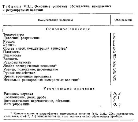 Условные обозначения измеряемых и регулируемых величин, используемые при обоих способах построения, приведены в табл. VII.1, а обозначения функциональных признаков приборов и регуляторов — в табл. VII.1.