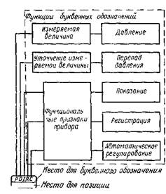 Буквенные обозначения располагают в определенном порядке слева направо. Сначала дают обозначение основной измеряемой или регулируемой величины, затем, в случае необходимости — обозначение ее уточняющее и далее — обозначение функциональных признаков прибора., Последние также располагают в следующем порядке: IRCSA.