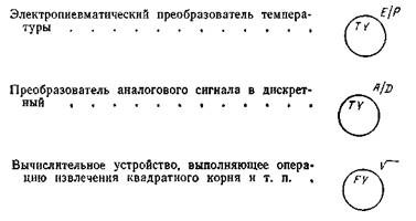 Дополнительные условные обозначения преобразователей сигналов и вычислительных устройств, расшифровывающие вид преобразования или операции, выполняемые вычислительным устройством, наносятся справа от графического изображения прибора. Приведем пример обозначения: