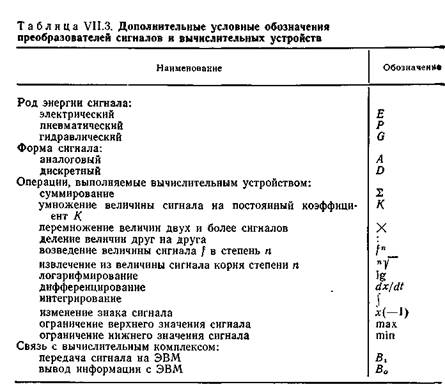 При развернутом способе построения средств автоматизации используют также дополнительные условные обозначения, отражающие функциональные признаки приборов и применяемые для построения, преобразователей сигналов и вычислительных устройств (табл. VII.3).