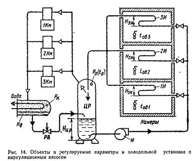 Рассмотрим, какие параметры требуется регулировать в холодильной установке с циркуляционным насосом (рис. 14).
