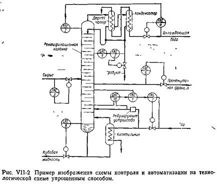 Пример изображения систем контроля и автоматизации на технологической схеме упрощенным способом показан на рис. VII.1. Примеры изображения функциональных схем автоматизации развернутым способом даны на рис. VII.3 и рис. VII.4.