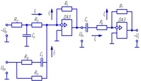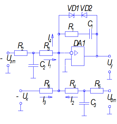 На рис.16. показана принципиальная схема регулятора тока и его входных цепей. Регулятор тока выполнен на операционном усилителе DA1. Последовательное включение в цепь обратной связи усилителя DA1 сопротивления R1 и емкости С1 обеспечивает пропорционально-интегральный тип регулятора. На входе усилителя DA1 суммируются три сигнала, приходящие по каналам задания на ток, обратной связи по току и по каналу компенсации ЭДС, путем суммирования токов I1, I2 и I3. В цепи задания на ток и в цепи обратной связи по току установлены фильтры на элементах R2, Rз, С2 и R4, R5, Сз соответственно. Нелинейный элемент НЭ1 реализуется на стабилитронах VD1 и VD2.