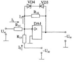 Принципиальная схема регулирующей части контура скорости представлена на рис.20. Регулятор скорости выполнен на операционном усилителе DA4. Суммирование сигнала задания на скорость и сигналаобратной связи по скорости осуществляется путем суммирования токов I1 и I2. Включение в цепь обратной связи усилителя DA4 сопротивления R16 обеспечивает пропорциональный тип регулятора. Стабилитроны VD3, VD4 реализуют нелинейный элемент НЭ2.