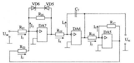 Принципиальная схема задатчика интенсивности представлена на рис.24. Нелинейный элемент реализуется на операционном усилителе DA7. Ограничение выходного сигнала обеспечивается за счет включения в цепь обратной связи усилителя DA7 стабилитронов VD5 и VD6. Интегратор реализуется на операционном усилителе DA6. Емкость С7 в цепи обратной связи усилителя DA6 определяет постоянную времени интегратора. Усилитель DA5 предназначен для инвертирования сигнала, чтобы обеспечить отрицательную обратную связь, охватывающую нелинейный элемент и интегратор (см. рис23.).
