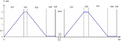 Торможение привода осуществляется противовключением до некоторой скорости, при которой оно уже неэффективно. Вторым этапом является механическое торможение. Причем механический тормоз включается заранее (с учетом его времени срабатывания 0,2с), так чтобы останов завершился к концу интервала tT .