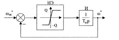 Задатчик интенсивности предназначен для формирования линейно изменяющегося во времени сигнала задания на скорость с определенным темпом. Структурная схема задатчика представлена на рис.23. Темп изменения выходного сигнала задатчика определяется уровнем ограничения Q нелинейного элемента (НЗ) и постоянной времени Ти интегратора (И).