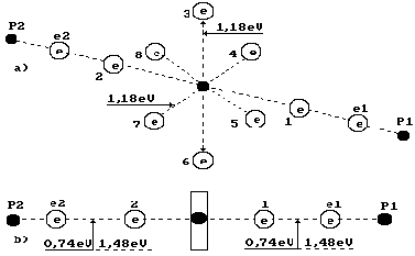 Обратим внимание, что на рис.5б показано две энергии связи между валентными электронами e2 и 2, а также между 1 и e1 . Электродинамическая связь равна 0,74эВ. Для разрыва этой связи достаточно затратить такое же количество механической энергии. Если же эту связь облучить фотонами с энергией 0,74эВ, то процесс поглощения фотонов будет идти так, что каждый из двух валентных электронов поглотит по 0,37эВ и энергия связи уменьшится до 0,37эВ, и молекула воды не разрушится. Вторая, тепловая энергия связи, указанная на том же рисунке, равна 1,48эВ. Если оба электрона поглотят фотон с этой энергией, то энергия связи между ними станет равной нулю и молекула воды разрушится.