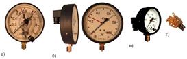 Электроконтактные манометры: а – манометр с электроконтактной приставкой; б и в – электроконтактные манометры ЭКМ160 и ЭКМ100 на основе микровыключателей; г – передаточный механизм с микровыключателями.