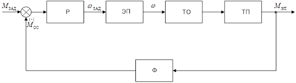 Технологический процесс состоит в следующем: задающее воздействие Мзад суммируется с сигналом обратной связи Мос, поступающим с тензометрического датчика момента и поступает на регулятор Р, на выходе которого формируется сигнал задания скорости ωзад, пропорциональный значению входного сигнала Мзад-Мос (ошибки по управлению ε). Сигнал задания скорости ωзад является управляющим воздействием для электропривода ЭП, задатчик скорости которого формирует сигнал напряжения управления Uу и подает на вход системы управления преобразователем, который, в свою очередь управляет двигателем и приводит его во вращение с скоростью ω. Далее приводной двигатель, работающий с заданной скоростью ω, приводит в движение редуктор который преобразует величину входного момента и формирует выходной сигнал Мэп.