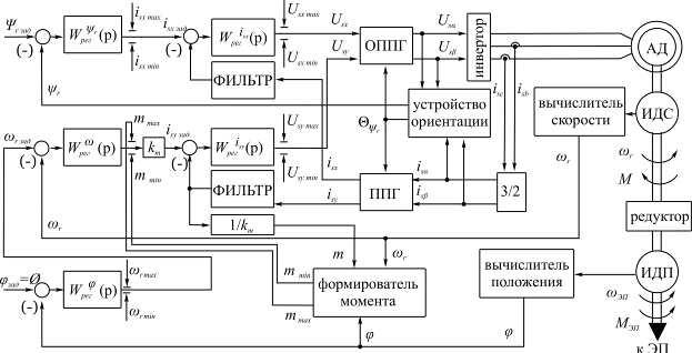 Применительно к нагрузочному моментному асинхронному ЭП следует выделить следующие нелинейности: ограничение на выходе регуляторов, линейные задатчики интенсивности в каналах управления потокосцеплением ротора и скоростью, двухмассовая механическая система с упругой связью, зазоры в кинематической цепи механической передачи.