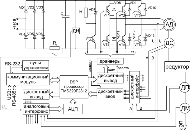 Электропривод подъемно-транспортных механизмов (ПТМ) в общем случае представляет собой сложный мехатронный модуль, объединяющий в своём составе систему управления, силовой преобразователь, асинхронный безредукторный двигатель с короткозамкнутым ротором. В качестве силового преобразователя может использоваться преобразователь частоты (ПЧ) или тиристорный регулятор напряжения (ТРН). Система управления обеспечивает требуемые режимы эксплуатации подъемно-транспортных механизмов, адекватную реакцию ЭП на изменение внешних условий, поддержку защитных функций и коммуникаций с другими устройствами.