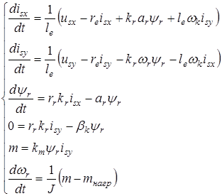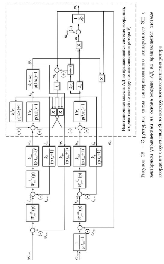 После проведения оптимизации отдельных контуров системы управления необходимо провести проверку показателей качества всей системы нагрузочного ЭП. Данный режим не принимает во внимание различные нелинейности, присущие системе любого ЭП и предполагает рассмотрение системы в линеаризованном виде. На рисунке 28 представлена структурная схема линеаризованного асинхронного ЭП с векторным управлением на основе имитационной модели АД во вращающейся системе координат с ориентацией по вектору потокосцепления ротора, т.е. в данном случае и система управления, и модель АД, как управляемый объект, находятся в одной и той же вращающейся системе координат.