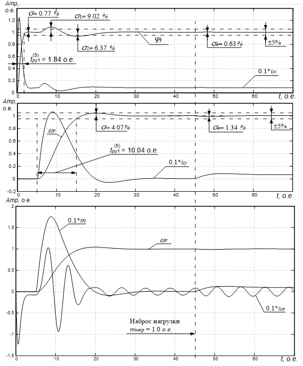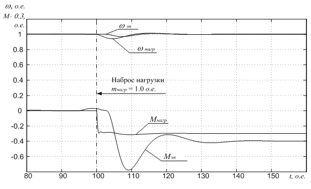 Условия для проведения исследований на рисунке 30 соответствуют пуску ЭП без нагрузки и её последующему набросу в момент времени tнагр = 45 о.е. с моментом mнагр = 1.0 о.е., соответствующем номинальной нагрузке.