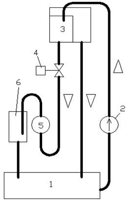 Вода из бака (1) подается в напорную емкость (3), при помощи насоса (2). Напорная емкость служит для стабилизации давления в системе, путем поддержания постоянного столба воды.Вода из напорной емкости через регулирующий клапан (4) и преобразователь расхода Метран 300ПР (5) самотеком поступает в измерительную емкость (6). Регулирующий орган и исполнительный механизм (4) служат для изменения расхода. Процент открытия РО можно задать при помощи кнопок “больше”, “меньше”. При нажатии кнопки “пуск” закрывается клапан и измерительная емкость заполняется водой. По мере заполнения емкости срабатывают датчики уровня и реализуется следующий алгоритм: