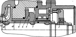 Осьові сили, що діють на ротор, сприймаються автоматичними врівноважуючими пристроями (рис. 2), які одночасно виконують функції упорного гідростатичного підшипника і комбінованого кінцевого ущільнення з саморегульованим торцевим зазором. Обидві ці функції однаково важливі, тому є всі підстави розглядати врівноважуючий пристрій як варіант безконтактного ущільнення.