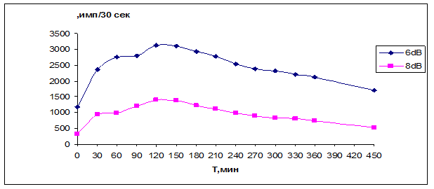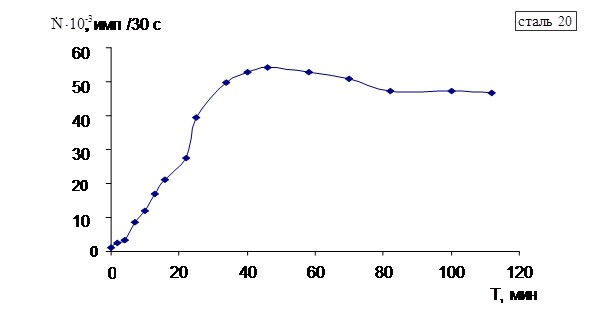 Рис. 5. Зависимость скорости счета от времени наводороживания; структура образца соответствует отпуску 2000 С, плотность катодного тока 2 мА/см2 , дискриминация 10 dB.