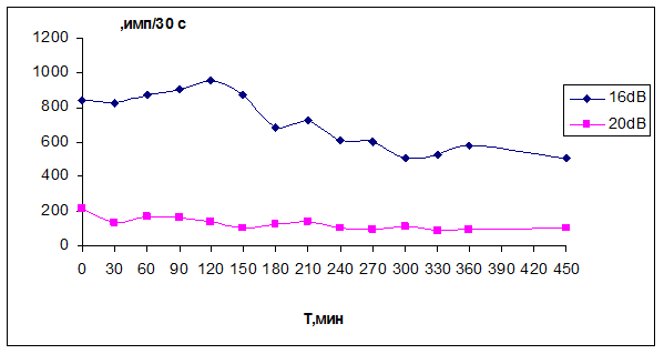 Были исследованы зависимости суммарного счета импульсов от времени наводороживания при различных уровнях дискриминации и плотностях катодного тока.