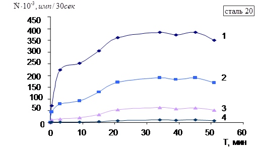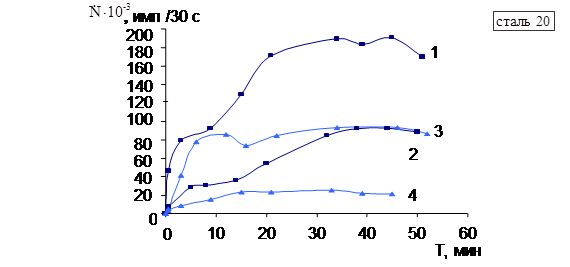 Рис. 4. Зависимость скорости счета от времени наводороживания стали 20; 1,2 – закаленные образцы, 3,4 – отожженные образцы;при уровне дискриминации 8dB.