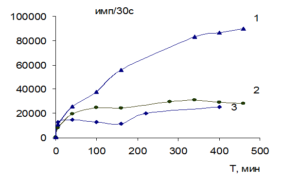 Рис. 7. Скорость счета акустической эмиссии отожженного образца при разных концентрациях H2 SO4 ; 1- 0,5н H2 SO4 , 2- 0,1н H2 SO4 , 3- 0,01н H2 SO4 ; плотность катодного тока 10 мА/см2 , дискриминация 8 dB.
