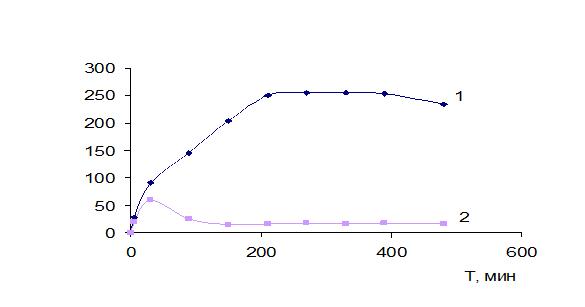 Рис. 3. Поведение скорости счета АЭ при наводороживании титанового сплава ВТ1-0, плотность катодного тока 10 мА/см2 ; 1- дискриминация 16 dB, 2- дискриминация 20 dB.