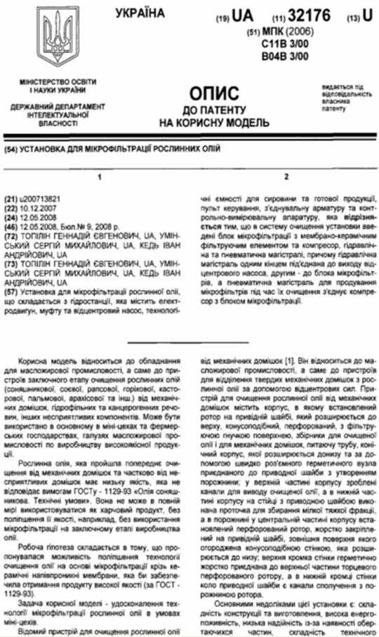 Биодизтопливо на основе рапсового масла может быть пригодными для использования в двигателях всех модификации без их конструктивного изменения. (Гідродинамічна установка для отримання біодизельного палива. Патент на корисну модельUA 31463 C10L8/00. Заявлено 05.12..2007. Опубл.10.04..2008.) Бюл .№7. Авторы: Топилин Г.Е., доктор технических наук, Уминский С.М., кандидат технических наук.