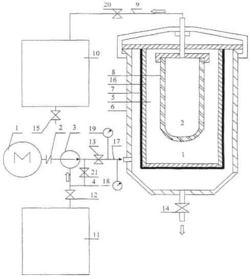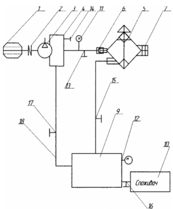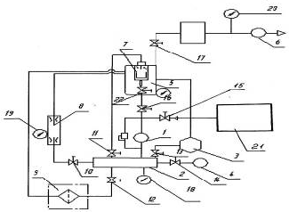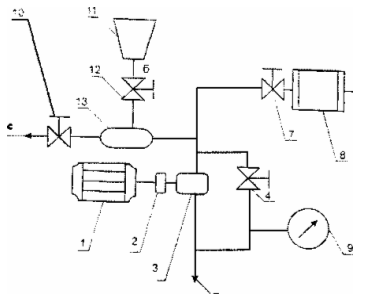 При включении приводного электродвигателя I через муфту 2 начинает вращаться гидронасос 3 и всасывает масло из внешнего источника в магистраль (а) при этом кран 4 должен быть открыт, а краны 7,10,12 закрыты. После того, как отрегулировали крапом 12 подачу дизтоплива из емкости 11 в смеситель инжектор 13, краном 4 регулируем предварительное рабочее давление в нагнетающей магистрали смесителя-дозатора 13 , которое контролируется манометром 9. Масло под давлением проходит по нагнетающей магистрали смесителя-дозатор а 13 и по магистрали (с) подается в технологический бак. После насыщения масла дизтопливом установку 01ключаем, а краны 10, 12 закрываем.
