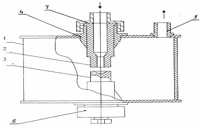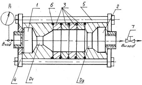 Кавитатор состоит из входного 1 и выходного 3 сопла с определёнными проходными сечениями. Между ними устанавливаются переходные секции 4. в секцию 5, устанавливается переходник 8 для манометра. Кавитатор собирается в виде гидродинамической трубы, секции зажимаются фланцами 5 стяжными болтами 7. Между секциями устанавливаются маслостойкие уплотнительные кольца. На входе из кавитатора устанавливается кран для подпора и регулирования давления.