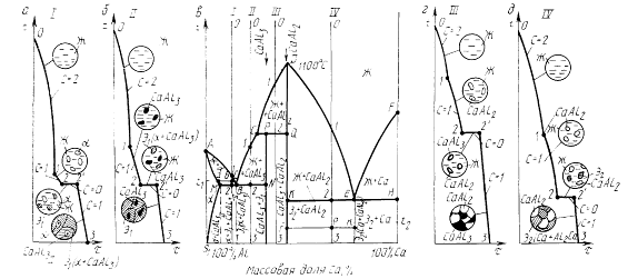 Рис. 5.1. Диаграмма состояния (в) и кривые охлаждения (а, б, г, д) сплавов системы Al - Са (структурный анализ):