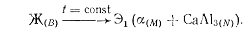К моменту охлаждения сплава до t2 содержание компонентов в последних порциях кристаллов α - твердого раствора будет соответствовать точке М, а в жидкости — точке В. Как видно, жидкость имеет эвтектический состав и потому она кристаллизуется по первой эвтектической реакции (С = 0), протекающей при постоянной температуре (t2 = t2’ ). С исчезновением при t2’ жидкости первичная кристаллизация заканчивается, а от t 2’ до t3 протекает вторичная кристаллизация сплава (из твердой α - фазы выделяется СаAl3 11 ).