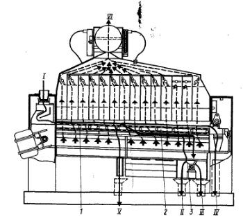 Технологическая схема моечной машины Ж9- БМА.1-приемная воронка, 2- задвижка, 3- шаровое основание, 4- ось, 5- приемный ковш, 6- верхние шнетки, 7 – нижние шнетки, 8- ижекторная труба, 9-выход мелких примесей, 10 – ситовой цилиндр, 11- бичевой ротор. I –исходное зерно, II- легкие примеси, III- вода, VI – воздух,V – очищенное зерно.