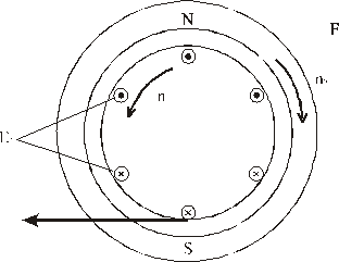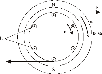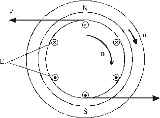 Пусть обмотка статора создаёт магнитное поле, вращающееся с частотой n0 в указанном направлении (рис. 2.9). Это поле будет наводить согласно закону электромагнитной индукции в обмотке ротора ЭДС. Направление ЭДС определяется по правилу правой руки и показано на рисунке (силовые линии должны входить в ладонь, а большой палец нужно направить по направлению движения проводника, т.е. ротора, относительно магнитного поля). В обмотке ротора появится ток, направление которого примем совпадающим с направлением ЭДС. В результате взаимодействия обмотки ротора с током и вращающегося магнитного поля возникает электромагнитная сила F. Направление силы определяется по правилу левой руки (силовые линии должны входить в ладонь, четыре пальца – по направлению тока в обмотке ротора). В данном режиме (рис. 2.9) электромагнитная сила создаст вращающий момент, под действием которого ротор начнёт вращаться с частотой n. Направление вращения ротора совпадает с направлением вращения магнитного поля. Чтобы изменить направление вращения ротора (реверсировать двигатель), нужно изменить направление вращения магнитного поля. Для реверса двигателя нужно изменить порядок чередования фаз подведённого напряжения, т.е. переключить две фазы.