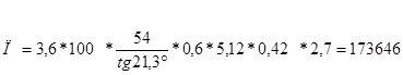 Рассчитаем производительность щековых дробилок П(в т/ч). Коэффициент рыхления 0,42, наименьшие размеры разгрузочной щели 54 м, ход щеки 73 м , угол между щеками 21,3º , вид материала – гранит крупнозернистый (ρ=2700 кг/ м³ ), длина разгрузочного отверстия 600 мм=0,6 м , частота вращения вала 5,12 сˉ¹