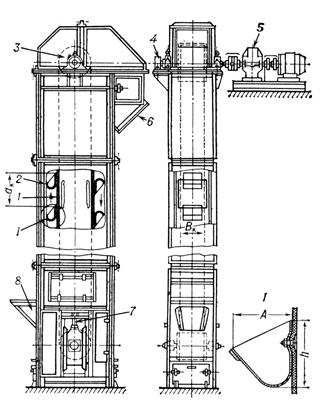 1 — тяговый орган; 2 — ковш; 3 — приводной барабан; 4 — останов; 5 — привод; 6 — разгрузочный патрубок; 7 — шпиндель натяжного устройства; 8 — загрузочный патрубок.