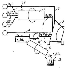 Схема процесса приведена на рис. 1. Аппаратура состоит из большой вращающейся обжиговой печи 1, гранулятора 9 и ротационного холодильника 12. Подаваемые материалы — вода 2, отработанная серная кислота H2 S04 3, хлористый калий КС1 4