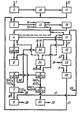 1 — бойлерные топки; 2 — бункер для зольной пыли; 3 — грануляция; 4 — окислительное хлорирование; 5 — холодильник; 6 — хлорид железа, продукт; 7 — фракционная дистилляция; 8 — пар; — хранилище хлорида кремния: — бункер для сухого продукта; // — магнитное разделение; 12 — магнетит; 13 — сушка гранул; 14 — подача воздуха; 15 — подача топлива; 16 — хранилище пакетированных гранул; 17 — восстановительное хлорирование; 18 — кокс; 19 — кислород; 20 — генератор оксида углерода; 21 — серная кислота; 22 — выщелачивание остатка; 23 — разделение фаз; 24 — твердая фаза в отвал; 25 — перегонка под давлением; 26 — товарный продукт; 27 — связующий раствор; 28 — многоцелевой испаритель; 29 — подача хлора; 30 — возврат СО и COf ; si — возврат тетрахлорида кремния; 32 — подача воды; 33 — хранилище хлорида алюминия; 34 — камера для дожигания