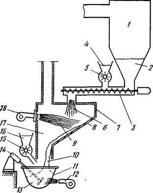 Схема аппарата для проведения процесса представлена на рис.1. Пыль 2, содержащая свинец, собирается в газоочистном сепараторе 1 и подается в плавильную печь 7 транспортером 3, например шнековым транспортером. В пыль могут быть введены добавки 4, такие как карбонат натрия или бура. Они подаются на транспортер 3 дозирующим устройством 5 в количествах, пропорциональных количеству пыли, подаваемой транспортером 3 в каждый момент времени. В этом случае транспортер выполняет также роль смесителя для пыли и добавок. Образующаяся при этом смесь 6 подается на наклонное рабочее пространство плавильной печи 7, где она нагревается пламенем 9 горелки 18, находящейся напротив рабочего пространства.