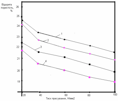 Аналіз одержаних даних свідчить про те, що незалежно від принципу укладки зерен, підвищення тиску пресування сприяє ущільненню маси і зниженню відкритої пористості виробів. Причому, для мас як з безперервним, так і з перервним зерновим складом збільшення вологості маси від 5% до 7,5% в інтервалі тиску пресування 20-100 Н/мм2 забезпечує зниження відкритої пористості виробів на 0,01% і 0,3% відповідно.