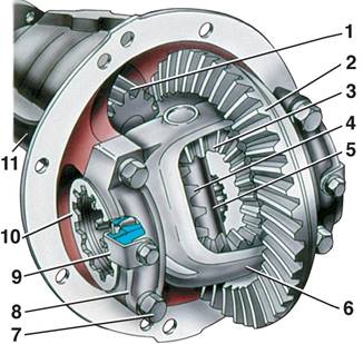 1 – ведущая шестерня; 2 – ведомая шестерня; 3 – сателлит; 4 – шестерня полуоси; 5 – ось сателлитов; 6 – коробка дифференциала; 7 – болты крепления крышки подшипника коробки дифференциала; 8 – крышка подшипника коробки дифференциала; 9 – стопорная пластина; 10 – регулировочная гайка подшипника; 11 – картер редуктора