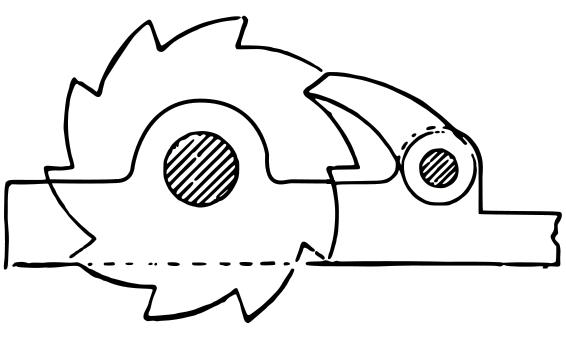 Кроме непрерывного вращательного движения, в машинах очень часто применяется прерывистое вращательное движение. Такое движение осуществляется при помощи так называемого храпового механизма (Рисунок 6). Основными частями храпового механизма являются: храповик (диск с зубцами), рычаг и собачка. Зубцы храповика имеют особую форму. Одна сторона у них сделана пологой, а другая отвесной или несколько подвнутренной. Храповик насажен на вал неподвижно. Рычаг же, сидящий рядом с храповиком, может свободно качаться. На рычаге имеется собачка, которая одним концом лежит на храповике. С помощью шатуна или тяги от того или иного ведущего механизма рычаг приходит в карательное движение, При отклонении рычага влево собачка скользит свободно по пологому склону зубцов, не поворачивая храповик. При отходе вправо собачка упирается в уступ зубца и поворачивает храповик на некоторый угол. Так, непрерывно качаясь в ту и другую сторону, рычаг с собачкой приводит храповик с валом в периодическое вращательное движение. Для надежного прилегания собачки к храповику собачка снабжается нажимной пружиной. Но бывает и другое назначение храпового механизма: для предохранения вала с храповиком от проворачивания. Так, у лебедки при подъеме груза храповик с собачкой не дают барабану провертываться обратно. Иногда нужно получить вращение храповика не только в одну сторону, но и в другую. В этом случае зубцы у храповика делают прямоугольными, а собачку — перекидной. Перекинув собачку вправо или влево, можно изменить и вращение храповика. Число зубцов на храповике зависит от требуемого угла поворота. На какую часть окружности поворачивается храповик, столько делают и зубцов. Например, если на 60° — одну шестую долю окружности, то берут 6 зубцов; на 30° — одну двенадцатую долю — делают 12 зубцов и т. д. Меньше шести зубцов на храповике обычно не бывает.