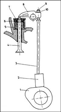 1 — Кулачок распределительного вала; 2 — Толкатель; 3 — Штанга толкателя; 4 — Клапан; 5 — Внешняя пружина; 6 — Внутренняя пружина; 7 — Тарелка; 8 — Коромысло привода клапана; 9 — Регулировочный винт; 10 — Контргайка