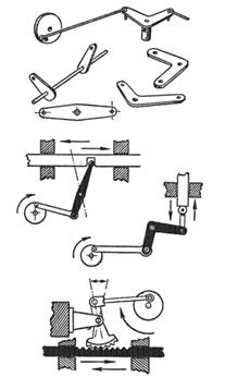 Допустим, движение происходит горизонтально, а его надо направить вертикально, вправо, влево или под каким-либо углом. Кроме того, иногда длину хода рабочего рычага нужно увеличить или уменьшить. Во всех этих случаях применяют шарнирно-рычажные механизмы (Рисунок 8). Рычажный механизм получает качательное движение от кривошипно-шатунного и передает его ползуну. Длину хода при шарнирно-рычажном механизме можно увеличить за счет изменения длины плеча рычага. Чем длиннее плечо, тем больше будет его размах, а, следовательно, и подача связанной с ним части, и наоборот, чем меньше плечо, тем короче ход. На рисунке показаны детали шарнирно-рычажных механизмов, которые могут быть применены в моделях. Шарнирно-рычажные механизмы имеются в моделях жатки-самосброски и сенокосилки. У жатки-самосброски через угловой рычаг передается движение ножу. У сенокосилки, кроме передачи к ножам, при помощи этих механизмов происходит подъем пальцевых брусьев.