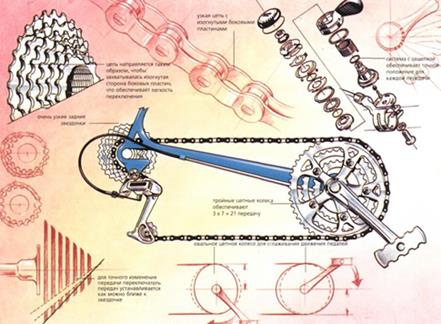 Цепи в основном делятся на два вида — кольцевые и пластинчатые. Обыкновенные кольцевые цепи обычно применяются для поднятия грузов, а пластинчатые как для поднятия грузов, так и для передачи вращения. Пример цепной передачи можно видеть у велосипеда. Цепная передача по сравнению с ременной удобна тем, что не дает проскальзывания и позволяет соблюдать правильность передаточного числа. Цепная передача осуществляется только при параллельных валах. Основной величиной цепной передачи является шаг. Шагом считается расстояние между осями роликов у цепи или расстояние между зубцами звездочки. Кроме роликовых цепей, в машинах широко применяются еще зубчатые, так называемые бесшумные цепи. Каждое звено их соединено из нескольких зубчатых пластин в ряд. Ширина этой цепи намного больше, чем роликовая. Звездочка такой передачи похожа на шестерню. Чтобы цепь не соскакивала с колеса, необходимо сделать на ней направляющие пластины. Зубчатые цепи могут работать на больших скоростях. Ими часто осуществляют передачу от мотора. Допустимое передаточное число цепных передач может быть до 1: 15. Самое малое число зубцов у звездочек берут: у роликовых цепей — 9, а у зубчатых — 13—15. Расстояние между осями звездочек принимают не менее полуторного диаметра большой звездочки. Как и в ременных передачах, так и здесь от одной ведущей звездочки одной цепью можно вращать несколько ведомых. Цепь надевается на звездочки не туго, как ремни, а с некоторым провисанием. Для регулирования натяжения часто применяют натяжной ролик. Число оборотов ведомой звездочки зависит от соотношения зубцов на обеих звездочках. Цепная передача в моделях.
