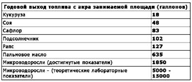 (Один американский галлон - это примерно 3,785 литра). Дело, как выясняется, не столько в цифрах абсолютного количества, возможно, гораздо важнее обратить внимание на в десятки раз превосходящие показатели микроводорослей относительно традиционных "сухопутных" культур.
