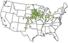 Карта работающих (темные точки) и строящихся (светлые точки) заводов по производству этанола в США.