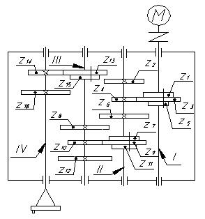 2 будуємо кінематичну схему за наведеною структурною формулою, врахувати, що шпиндельна бабка з’єднана з коробкою швидкостей без пасової передачі. Приклад кінематичної схеми подано на рисунку 1.