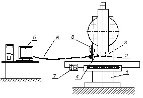 Для визначення дійсного значення частот обертання застосовується експериментальний стенд, що складається із верстата 6Р13Ф2, допоміжного інструмента та оснащення, датчика обертів шпинделя, ЕОМ та програмного забезпечення.На рисунку 4 подано загальний вигляд експериментального стенду, де показані: