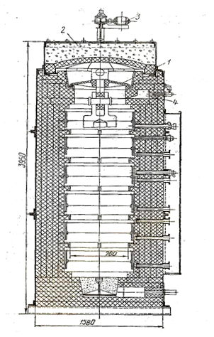 Малі вертикальні печі розраховані на високі, середні й низькі температури. Високотемпературні електричні печі (до 1300°С) частіше мають квадратний перетин і нагріваються горизонтально розміщеними глобаровими стрижнями. Середньотемпературні (до 1000°С) і низькотемпературні (до 700°С) печі нагріваються металевими елементами опору, розміщеними на внутрішніх стінках печі. На рис. 1 наведена конструкція вертикальної средньотемпературної електричної печі потужністю 70 кВт із трьома регульованими зонами. Деталі підвішують на диску 1. Кришку печі 2 піднімають і відводять убік поворотним механізмом, що приводяться у рух електродвигуном 3 потужністю 0,5 кВт. Для зменшення окиснювання металу, що нагрівається, у піч зверху й знизу через камери 4 підводять захисний газ.