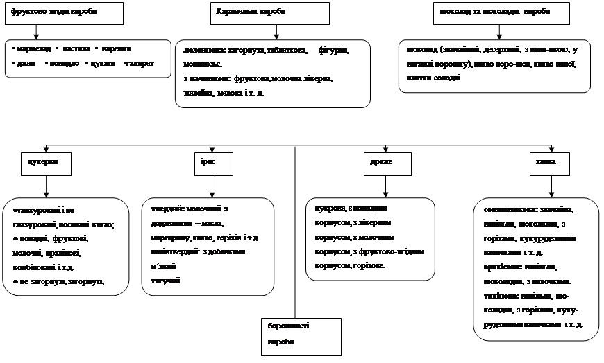 Асортимент кондитерських виробів досить різноманітний. Залежить він від основної сировини, упакування обробки поверхні та технології вирощування. Розглянемо класифікацію кондитерських виробів за схемою 1.