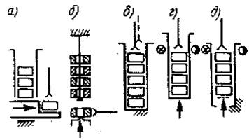 Накопительные устройства могут иметь вид магазинов с вертикально расположенными стопками деталей (рис. 4). Деталь подается роботу поштучно снизу при помощи шиберного устройства (рис. 4, а) или вертикально движущегося съемного устройства (рис. 4, б). Манипулятор берет деталь и пошагово перемещается сверху вниз (рис. 4, в); или же деталь подается манипулятору путем пошаговой подачи самого магазина (рис. 4, г) либо стопки деталей внутри магазина (рис. 4, д).